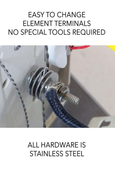 Industrial-grade ceramic terminal blocks make changing elements easy. All contact between elements and wire lugs is over a wide surface of heavily torqued stainless steel washers.