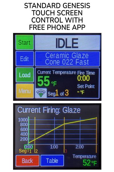 The Genesis control includes a touchscreen interface and WIFI connectivity. The intuitive interface is easy to use and understand. A free phone app allows you to monitor your kiln remotely.