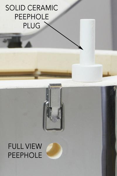 STOP BREAKING PEEPHOLE PLUGS. Solid large non-tapered peepholes allow a wider view into the kiln. The peephole plugs are made from solid ceramic and are not as fragile as hollow-type plugs used on competitors' kilns.